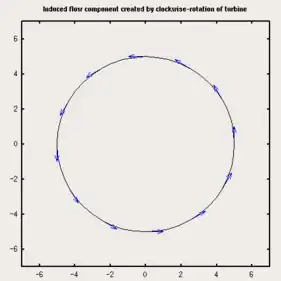 As the turbine rotates, in this case in a clockwise direction, the motion of the foil through the fluid changes the apparent velocity and angle of attack (speed and direction) of the fluid with respect to the frame of reference of the foil. The combined effect of these two flow components (i.e. the vector sum), yields the net total "Apparent flow velocity" as shown in the next figure.
