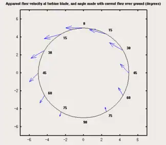[With regards to the figure "Apparent flow velocity...", Lucid Energy Technologies, rights holder to the patent to the Gorlov Helical Turbine, notes that this diagram, with no apparent velocity at an azimuth angle of 180 degrees (blade at its point in rotation where it is instantaneously moving in downstream direction), may be subject to misinterpretation. This is because a zero apparently flow velocity could occur only at a tip speed ratio of unity (i.e. TSR=1, where the current flow induced by rotation equals the current flow). The GHT generally operates at a TSR substantially greater than unity.]