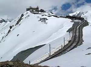 The Gornergrat Railway (German: Gornergrat Bahn; GGB) is a mountain rack railway, located in the Swiss canton of Valais. It links the resort village of Zermatt, situated at 1,604 m (5,262 ft) above mean sea level, to the summit of the Gornergrat. The Gornergrat railway station is situated at an altitude of 3,089 m (10,135 ft), which makes the Gornergrat Railway the second highest railway in Europe after the Jungfrau, and the highest open-air railway of the continent. The line opened in 1898, and was the first electric rack railway to be built in Switzerland.[1][2][3] The Gornergrat is a starting point for many hikes, as it lies surrounded by 29 peaks rising above 4,000 m (13,123 ft) in the Alps and several glaciers, including the Gorner Glacier (which is billed as the second longest glacier in the Alps). At the end of the line on Gornergrat, the Matterhorn is visible on a clear day. It is also a popular skiing area.[3]