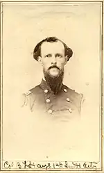 - U.S. Army Colonel James Ellis Burton was born on 23 September 1824 to John and Nancy Agnes (née Wishard) Burton in Mount Tabor, Indiana. He was married to Cynthia Ann (née Van Buskirk), and they had one son. He was promoted to colonel on 4 May 1865 and mustered out on 21 July 1865.[14] Colonel Burton fought in the Atlanta Campaign, the Savannah Campaign, and the Carolinas Campaign. He was a merchant before the war and a farmer in Gosport afterwards.[15] He died on 28 September 1900.