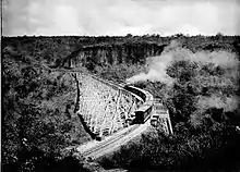 The Goteik viaduct (Burmese: ဂုတ်ထိပ်တံတား, MLCTS: gu.hti.ta.aa.) also known as Gohteik viaduct) is a railway trestle in Nawnghkio, western Shan State, Myanmar (also known as Burma). The bridge is between the two towns of Pyin Oo Lwin, the summer capital of the former British colonial administrators of Burma, and Lashio, the principal town of northern Shan State. It is the highest bridge in Myanmar and when it was completed, the largest railway trestle in the world. It is located approximately 100 km northeast of Mandalay.