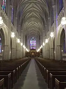 The first of these new vaults had an additional rib, called a tierceron, which ran down the median of the vault.[64] It first appeared in the vaults of the choir of Lincoln Cathedral at the end of the 12th century, then at Worcester Cathedral in 1224, and then the south transept of Lichfield Cathedral.[63]