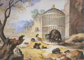 His chief diligence and most careful elegance he brought to work in the painting of his beloved cats. He had both the art to seize the general nature of this animal and to reflect the specific character of each. The sycophantic look full of falseness, the dainty movements of the kittens, several of which are sometimes painted sporting round their dam—all this, in the most multifarious postures, turns, groups, sports, and quarrels, is depicted with a true observance to nature.[5]