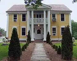 The Governor Samuel Huntington House is located in the Norwichtown neighborhood of Norwich, one of its early settlement areas. It is on the south side of East Town Street, just west of its junction with Huntington Lane. It is a 2+1⁄2-story wood-frame structure, five bays wide, with a side-gable roof and clapboard siding. Its most prominent feature is a monumental entry portico, rising a full two stories to a gabled pediment, supported by paired columns. The main entry is flanked by sidelight windows and a carved woodwork surround, and there is a latticework porch above. The entry portico and wide entry section are 19th-century alterations, and there have been significant interior alterations, accommodating the building's 20th-century use as an office.[2]