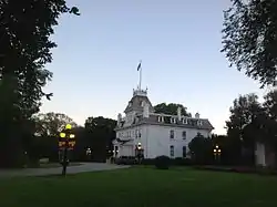 The current provincial royal residence was constructed in 1883, at a cost to the federal Crown of $23,995.[3] However, the building was two years later, on 10 June, purchased by the provincial Crown for $1, with the provision that the house be used as a residence for the viceroy "and for no other purpose," as written by John A. Macdonald at the bottom of the Order in Council transferring the house.[2] In 1901, the royal home played host to the Duke and Duchess of York (later King George V and Queen Mary), as well as the Duchess' brother, Prince Alexander of Teck (who would later become Governor General of Canada); Prince Edward, Prince of Wales (later King Edward VIII), and Prince George, Duke of Kent, in 1919 and 1941; and King George VI was the first reigning monarch to reside at Government House when he and his wife, Queen Elizabeth, stopped in Winnipeg during their cross-country tour of Canada in 1939; from Government House, the King broadcast over the radio a speech to the British Commonwealth, the table at which he sat still in the residence.[6] Their daughter, Queen Elizabeth II, her husband, Prince Philip, Duke of Edinburgh, and each of their children have also stayed at Government House over the years.[7]