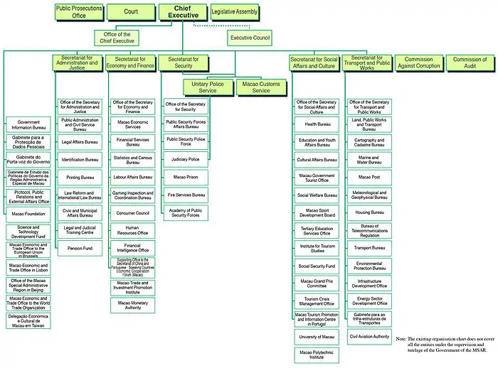 The secretaries are similar to the Hong Kong Government policy bureaux secretaries. However, there are fewer secretaries in Macau, and they are considered part of the civil service instead of officials employed on contracts.[2] The current (fifth) government was inaugurated in December 2019.[3]