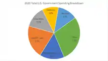 For most governments around the world, the majority of government spending takes place at the federal/national level. As of 2019, in the United States, approximately 55% of government spending is spent by the federal government, while the remaining 45% of government spending is spent by state and local government.[7][8] Federal government spending in the United States can be broken down into three general categories: mandatory/entitlement spending, discretionary spending, and interest on government debt.[9]
