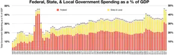 At the beginning of the 20th century, the majority of government spending in the United States took place at the local level. However, federal spending increased relative to state and local spending as a result of World War I and World War II, and by the 1930s, state and local government spending accounted for less than one half of government spending. By 2019, federal spending was more than 20% of GDP, while state and local spending hovered around 17% of GDP.[18][20] As a result, in recent years, state and local governments account for approximately 45% of total government expenditures.[8] State and local government spending is typically spent in 6 broad categories: elementary and secondary education, higher education, health, welfare, police and safety, and transportation.[8][21] Over the last few decades, funding for education at the state level has fallen, while funding for health has more than doubled.[22]