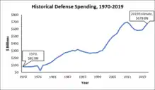 National defense spending is any government spending attributable to the maintenance and strengthening of the United States Armed Forces, including the Army, Navy, Marines, and the Air Force.[14] As of the fiscal year 2019 budget approved by Congress, national defense is the largest discretionary expenditure in the federal budget.[13] Figure C provides a historical picture of military spending over the last few decades. In 1970, the United States government spent just over $80 billion on national defense. Over the next two decades, national defense spending increased steadily to around $300 billion per year.[10] Military spending fell in the 1990s, but increased markedly in the 2000s as a result of the War in Afghanistan and Iraq. Military spending was cut slightly during the Obama Administration, but the Trump Administration plans to ramp up military spending to combat ISIL. National defense spending is expected to be $678 billion in 2019, an amount greater than the military expenditures of the next 9 countries combined.[15]