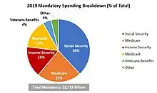Figure A provides a breakdown of the major mandatory government spending categories as of the fiscal year 2019 budget approved by Congress. As Figure A suggests, Social Security is the single largest mandatory spending item, taking up 38% or nearly $1,050 billion of the $2,736 billion total. The next largest expenditures are Medicare and Income Security, with the remaining amount going to Medicaid, Veterans Benefits, and other programs.[11][12]