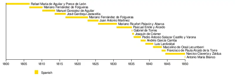 | No. | Portrait | Name | Tenure start | Tenure end | Viceroy of New Spain | Monarch |