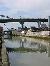 At approximately 14th Street along the eastern bank, Hamilton Avenue and the Gowanus Expressway cross the canal at a diagonal from southeast to northwest, connecting to Lorraine Street on the western bank.[5] Separate movable bascule bridges built in 1942 carry both directions of Hamilton Avenue's traffic,[6] while the Gowanus Expressway rises on a viaduct far above the canal.[16]
