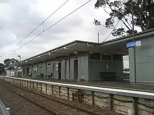 In 1998, Gowrie was upgraded to a premium station.[12] Also in that year, the track from Fawkner to Gowrie was duplicated and boom barriers were provided at the Box Forest Road level crossing, located nearby in the down direction of the station.[13] Immediately north of the station, the double track merges into a single track, which continues to the terminus at Upfield.[4] Prior to 1998, Platform 1 was a dock platform,[14] requiring trains to cross further down the line near Merlynston.
