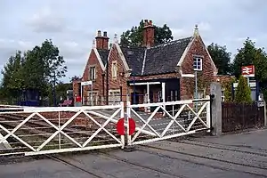 It is the last station, when travelling from Cleethorpes towards Barton, to still have two platforms and the original station buildings. The buildings are no longer in railway use (the station has been unstaffed since 1969) and are in private ownership.[2] The station signal box controls a nearby level crossing that still (as of summer 2016) has manually-wound wooden gates rather than modern lifting barriers. Since the main line was re-signalled in January 2016, the box has become the 'fringe' on this route to the York Rail Operating Centre.