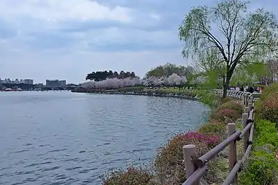 Ilsan Lake Park is the largest artificial lake in East Asia. Visitors can follow the trail by riding a bicycle or enjoying weekend performances and shows.[18]