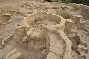 2 types of circular constructions have been discovered at it was in Shomutepe: large and small. The diameter of large circular constructions reached 3.5 m, while the smaller ones had a diameter up to 2 m. The smaller circular constructions used to generally connect with wing walls, although the larger ones were preferred to be mainly independent or not entirely enclosed. There were also revealed other structures such as ovens and bins. After examinations of these structures, it was affirmed that these units were built one by one in a sequential manner with a specific distribution pattern. The settlement featured circular or oval unit with a diameter of 7-8 m, including a number of round-shaped constructions connected with wing walls to surround a courtyard. There was a break on the enclosure wall for each unit which are assumed to be used as the entrance to the yard.[2]