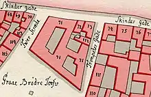 The entire north side of the square was part of one large property in the late 17th century. In 1689, it was listed as No. 83 in Frimand's Quarter and owned by Ceremonimiester Frederik Gersdorff (1650–1691).[1] Together with most of the other buildings in the area, the property was destroyed in the Copenhagen Fire of 1728. Counter Admiral Peter Hiort constructed a large new townhouse on the site in the early 1730s. It was later acquired by Wilhelm, Count Gyldencrone. The property was listed as No. 71 from 1756. The building comprised a 20-bay-long main wing on Ulfeldts Plads (now Gråbrødretorv) and a two-storey secondary wing on Trompetergangen (now Niels Hemmingsens Gade).