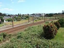 Electrification of the Woburn – Hutt Park section commenced in 1953 using the 1.5 kV DC overhead line system, coinciding with the electrification of the Wairarapa Line between Wellington and Taita. The catenary was extended slightly in 1959-60 to allow for EMUs running race trains to Hutt Park to use a workshops siding. A further extension of the catenary was opened in 1966 for goods trains to Gracefield Freight Terminal.[6] Though there were no electric trains running on the branch from 1983 following the cessation of the workers' trains to the workshops, and the catenary and related electrification infrastructure were removed in 1990.[7][8]