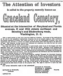 Graceland Cemetery was created due to the need for a large, rural cemetery for African Americans in Washington, D.C., in the late 1800s. At the time, nearly all non-Catholic cemeteries in the city were racially segregated, with whites-only burial grounds refusing to inter black citizens.[1] By 1850, there were 16 cemeteries in the city of Washington, but only three served African Americans: (Eastern Methodist Cemetery, or "Old Ebenezer Cemetery"; the Harmoneon Cemetery, and Mount Pleasant Plains Cemetery).[lower-alpha 1] On June 5, 1852, the D.C. City Council enacted legislation to prohibit interments at any burying ground inside the limits of the Federal City and to ban the establishment of new burial grounds within the Federal City.[2][lower-alpha 2]