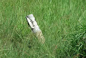 The 9M22S munition (see below) was developed by NPO Splav during the Soviet era.[36][37] Instead of a high-explosive fragmentation warhead, the 9M22S rocket carries a warhead containing 180 separate 9N510 incendiary elements.[38] Designed to ignite vegetation, storage facilities, or fuel, these incendiary elements consist of hexagonal prisms made from a magnesium alloy known to the Russian GOST as ML-5,[39][40] filled with a thermite mixture.[41][42] Each element has a nominal length of 40 mm and a width of 25 mm and a burning time of at least 2 minutes. It is also noted that the effect of these incendiary, as well as conventional lighting munitions (especially at night), outwardly resembles the use of phosphorus munitions.[36]