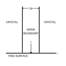 The general way to measure grain boundary diffusion coefficients was suggested by Fisher.[3] In the Fisher model, a grain boundary is represented as a thin layer of high-diffusivity uniform and isotropic slab embedded in a low-diffusivity isotropic crystal. Suppose that the thickness of the slab is , the length is , and the depth is a unit length, the diffusion process can be described as the following formula. The first equation represents diffusion in the volume, while the second shows diffusion along the grain boundary, respectively.