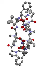 It is a derivative of gramicidin, produced by the gram-positive bacterium Brevibacillus brevis. Gramicidin S is a cyclodecapeptide, constructed as two identical pentapeptides joined head to tail, formally written as cyclo(-Val-Orn-Leu-D-Phe-Pro-)2. That is to say, it forms a ring structure composed of five different amino acids, each one used twice within the structure.[2] Another interesting point is that it utilizes two amino acids uncommon in peptides: ornithine as well as the atypical stereoisomer of phenylalanine. It is synthesized by gramicidin S synthetase.[3]