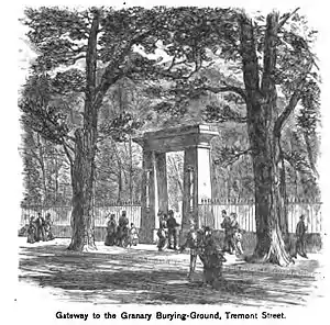 Eleven large European elms fronted it on Tremont Street.[5] The elms were planted in 1762 by Major Adino Paddock and John Ballard and reached ten feet in circumference by 1856. The walk under the elms was known as "Paddock's Mall," while the rest of the grounds were devoid of any trees at all. The first major improvement was undertaken in 1830, when a number of trees were planted around the grounds. The property was improved again in 1840 by the construction of an iron fence on Tremont Street. The fence was designed by Boston architect Isaiah Rogers at a cost of $5,000, half paid by the city and half by public subscription.[6] Rogers designed an identical Egyptian revival gateway for Newport's Touro Cemetery.[2]