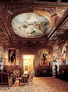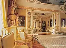 During the German occupation in the Second World War, the Grand Ducal Palace was used by the Nazis as a concert hall and tavern.[1] Much of the palace's furniture, art collections and jewels were ruined.[1] Large swastika flags were hung down the front.[1] With the return of Grand Duchess Charlotte from exile in 1945, the palace once again became the seat of the Grand Ducal Court.