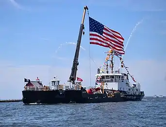 Grand Haven is home to the United States Coast Guard's "Sector Field Office Grand Haven." The first Coast Guard presence in the city was in 1924. The Coast Guard cutter Escanaba was based in the city until the Second World War. After it was sunk by a U-boat of Nazi Germany's Kriegsmarine, the citizens of Grand Haven raised more than $1,000,000 in bonds to build a replacement cutter bearing the same name; several pieces of wreckage remain displayed on the city's waterfront. Grand Haven hosts the annual Coast Guard Festival, a celebration based on Coast Guard Day, which draws U.S. and Canadian vessels along with parades of bands and other activities, including a memorial to the 101 sailors lost in the Escanaba sinking. The yearly attendance for this event exceeds 300,000 people over the two-week period of the festival. Grand Haven is the first city officially designated as Coast Guard City, USA by an act of Congress signed by President Bill Clinton. The act was Public Law 105-383 enacted by the United States Congress and signed by the president on November 13, 1998.[11]