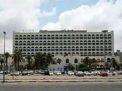 The Original hotel stands in an extensive open park which overlooks the then unfilled Tripoli harbor, not far from the Algerian embassy and Tripoli Cathedral - Jamal Abdul Nasser Mosque. It has 350 rooms.[2] It is noted for its many arches, inspired by the original building's facade, which form the basis of the structure. The hotel once had a propaganda poster on the outside of the hotel that showed a crying child superimposed above a montage of the wreckage caused by the attack by the British.[3]