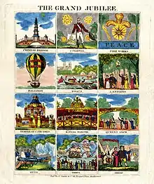 The event was centred on London's Royal Parks, which were lit with lanterns during the night.[3] The Prince Regent's personal architect John Nash was commissioned to design a Chinese-style bridge and pagoda across the canal in St James's Park.[1][3] A "Temple of Discorde" was erected in Green Park which, by means of a mechanism designed by Sir William Congreve and under cover of firework display, transformed into a "Temple of Concorde". During the fireworks display aeronaut Windham William Sadler ascended in a hot air balloon and distributed favours and programmes onto the crowd below.[4] Also a sign reading "PEACE" was illuminated.[3] During the jubilee night Nash's pagoda set alight and at least one man, James Taylor,[2][5] was killed.[6]