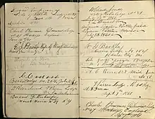 Freemasonry was established early in New Mexico's time as a territory of the United States, and Masonic lodges began to spring up in many areas where American immigrants increasingly settled. This phenomenon was highly accelerated by the extension of railroads into the Territory, starting in 1879.[10] In 1880 the railroad reached Albuquerque, and in 1881 Temple Lodge No.6 was chartered.[11] Gate City Lodge No.11 was established in Raton, where the Atchison, Topeka and Santa Fe Railway first crossed the pass into New Mexico three years prior.[12] The Southern Pacific Railroad joined two lines coming from the east and west at Deming in 1881, and in 1883 Deming Lodge No.12 was formed.[13] When the Santa Fe Railroad built shops at San Marcial in 1880, a community began to grow up around them, and in 1885 there were enough Masons living there to found Hiram Lodge No.13,[14] which became known as one of the "railroad Lodges." Logging and grazing in the area of Chama, New Mexico led to the extension of a line into the valley in the late 1880s, and Chama Lodge No.17 was chartered in 1889.[15] The trend continued for as long as the railroad boom was maintained, well into the 20th century. Many Lodges in New Mexico, including Bethlehem, Chama, Tucumcari, and Hiram still display images of Gilded Age locomotives on their banners in homage to their history.