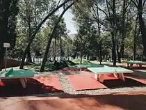 The Park is otherwise called the "Lung of the City" due to the diversity of plants. It also includes Botanical Garden and the Zoo and also a complex of swimming pools.[5] In addition the Park has an amphitheatre, where various cultural activities occur especially in summer months.[5] The artificial lake is a well known fishing and also swimming area. The lake was built from local waters in 1955 on volunteer work to build a 400 metres long dam that holds the waters from overflowing onto Tirana.[5]