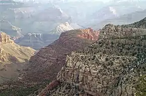 The Grand Scenic Divide is so named because it is here where the Grand Canyon markedly changes in geologic and scenic character. To the east are the isolated towers, buttes, temples, and side canyons which are the essence of its visual appeal, and to the west an absence of such striking scenery.[5] This natural line of demarcation also happens to be where the granite of the inner gorge disappears, such that buttes did not form once the river flowed only through the sedimentary rocks.[6] This geographical feature's name was applied by William Wallace Bass, and later officially adopted in 1932 by the U.S. Board on Geographic Names.[2][7]