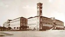 In 1897, a clock tower[nb 1] was built near the Grand Serail to celebrate the anniversary of Sultan Abdul Hamid II's coronation[3] and to make up for the absence of a public clock indicating mandatory Muslim prayer times especially that many foreign institutions had built western style clock towers. The construction of the clock tower was approved by the Sultan following a letter of supplication from Beirut's governor Rashid Bey. The ceremonial laying of the first stone took place on 9 January 1897 (the birthday of the Sultan) in the presence of high officials, military representatives and members of the municipality of Beirut.[6]