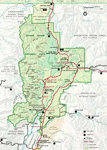Grand Teton National Park is located in the northwestern region of the U.S. state of Wyoming.[57] To the north the park is bordered by the John D. Rockefeller Jr. Memorial Parkway, which is administered by Grand Teton National Park. The scenic highway with the same name passes from the southern boundary of Grand Teton National Park to West Thumb in Yellowstone National Park.[36] Grand Teton National Park covers approximately 310,000 acres (130,000 ha), while the John D. Rockefeller Jr. Memorial Parkway includes 23,700 acres (9,600 ha).[58] Most of the Jackson Hole valley and virtually all the major mountain peaks of the Teton Range are within the park. The Jedediah Smith Wilderness of Caribou-Targhee National Forest lies along the western boundary and includes the western slopes of the Teton Range. To the northeast and east lie the Teton Wilderness and Gros Ventre Wilderness of Bridger-Teton National Forest.[59] The National Elk Refuge is to the southeast, and migrating herds of elk winter there. Privately owned land borders the park to the south and southwest. Grand Teton National Park, along with Yellowstone National Park, surrounding National Forests and related protected areas constitute the 18-million-acre (73,000-square-kilometer) Greater Yellowstone Ecosystem. The Greater Yellowstone Ecosystem spans portions of three states and is one of the largest intact mid-latitude ecosystems remaining on Earth.[60] By road, Grand Teton National Park is 290 mi (470 km) from Salt Lake City, Utah and 550 mi (890 km) from Denver, Colorado.[61]
