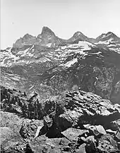During the last 25 years of the 19th century, the mountains of the Teton Range became a focal point for explorers wanting to claim the first ascents of the peaks. However, white explorers may not have been the first to climb many of the peaks and the earliest first ascent of even the formidable Grand Teton itself might have been achieved long before written history documented it. Native American relics remain including The Enclosure, a human-made structure that is located about 530 ft (160 m) below the summit of Grand Teton at a point near the Upper Saddle (13,160 ft (4,010 m)).[39][40] Nathaniel P. Langford and James Stevenson, both members of the Hayden Geological Survey of 1872, found The Enclosure during their early attempt to summit Grand Teton. Langford claimed that he and Stevenson climbed Grand Teton, but were vague as to whether they had made it to the summit. Their reported obstacles and sightings were never corroborated by later parties. Langford and Stevenson likely did not get much further than The Enclosure.[9] The first ascent of Grand Teton that is substantiated was made by William O. Owen, Frank Petersen, John Shive and Franklin Spencer Spalding on August 11, 1898.[39] Owen had made two previous attempts on the peak and after publishing several accounts of this first ascent, discredited any claim that Langford and Stevenson had ever reached beyond The Enclosure in 1872. The disagreement over which party first reached the top of Grand Teton may be the greatest controversy in the history of American mountaineering.[9] After 1898 no other ascents of Grand Teton were recorded until 1923.[41]