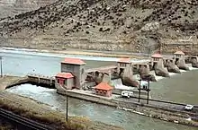 The Grand Valley Diversion Dam is a diversion dam in the De Beque Canyon of the Colorado River, about 15 miles (24 km) northeast of Grand Junction, Colorado in the United States. It is a 14-foot (4.3 m) high, 546-foot (166 m) long concrete roller dam with six gates, which were the first and largest of their kind to be installed in the United States.[3]