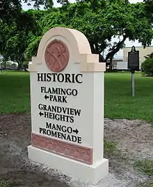 One of the city's oldest neighborhoods still intact, Grandview Heights was built as an extension of Palm Beach Heights from around 1910 to 1925. The neighborhood has one of the city's best collection of early craftsman-style bungalows, as well as some modest, Mediterranean revival-style homes. Grandview Heights first residents were ministers, downtown shopkeepers, and the craftsmen who built the luxury hotels of Palm Beach. Despite having modest elevation, it contained the highest elevation to the south to Cuba, and at the time provided views of Lake Worth Lagoon over Woodlawn Cemetery and Pioneer Memorial Park.[3][4] After a period of urban decline in the 1980s, almost all of Palm Beach Heights and portions of Grandview Heights were demolished in 1989 to make way for the proposed Downtown/Uptown urban revitalization project. This land, immediately north of the neighborhood, later became CityPlace, a New Urbanist mixed-use shopping and dining district.