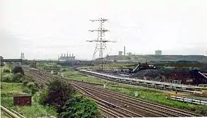 The station opened as Eston Grange on 22 November 1885 by the North Eastern Railway. It was situated about 1 km from the current Grangetown.[1] The station's name was changed to Grangetown on 1 January 1902.[2] Grangetown was one of the stations to have been adversely affected due to the closure of factories, having only a few passengers left.[3] The station was closed to passengers on 25 November 1991.[4]