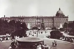 In 1934, the bowl was moved north of the cathedral because it was in the way of the Nazis' marches, and they paved the square. During the Battle of Berlin in World War II, it was damaged by shell fragments. In the GDR, the Lustgarten became part of the newly developed Marx-Engels-Platz. The bowl was kept for a while between the barracks of the Berlin Cathedral Construction Works before being returned to its original location in 1981 in honor of Schinkel's 200th birthday.[28] A larger defect at the edge of the bowl, which was caused by the effects of war, was repaired with a so-called crossing of red granite (see illustrations).[29]