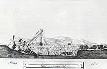 The first splitting of the stone did not go as planned, resulting in the need to remove larger stone protrusions with hand tools. A second attempt in early November also failed, requiring further removal of stone protrusions by hammer and chisel. It was not until December 23, 1827, that the 5-foot thick stone slab (shown in the diagram as bd-ac) was finally turned to work on the underside of the bowl (shown as ba down). Turning the 225-ton slab required 100 workers and 23 hoists. Once the underside was finished on April 26, 1828, the hollowing of the bowl continued until August 4.