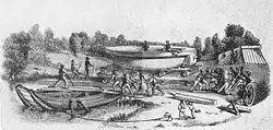 The bowl, which weighed between 70 and 75 tons at that time, was transported to the Spree River using wooden rollers. A boardwalk and a road through the forest to the Spree were constructed; the route is still recognizable today. The transport took six weeks; daily progress was 600 feet (188 m). To put the shell onto a wooden ship that had been properly braced for this task, 54 workers were required.