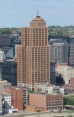 The Grant Building is 40-story, 147.8 m (485 ft) skyscraper at 310 Grant Street in downtown Pittsburgh, Pennsylvania. The building was completed and opened on February 1, 1929[5] at a cost of $5.5 million ($86.8 million today). The Art Deco building's facade is built with Belgian granite, limestone, and brick. It was famous for a radio antenna that rose roughly 100–150 feet (30–46 m) from the roof of the tower and had an aviation beacon that spelled out .--. .. - - ... -... ..- .-. --. .... or P-I-T-T-S-B-U-R-G-H in Morse Code. The beacon could be seen as far away as 150 miles (240 km) on clear nights. A smaller version of the beacon, still flashing out the name of the city remains to this day, although malfunctions with the relay switch caused it to spell "P-I-T-E-T-S-B-K-R-R-H", and eventually "T-P-E-B-T-S-A-U-R-G-H" before being repaired on July 27, 2009.[6]