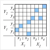 As an example of this last point, consider the feature space shown to the right. The variables may each be regarded at two different resolutions. Variable may be regarded at a high (quaternary) resolution wherein it takes on the four values or at a lower (binary) resolution wherein it takes on the two values Similarly, variable may be regarded at a high (quaternary) resolution or at a lower (binary) resolution, where it takes on the values or respectively. At the high resolution, there are no detectable implications of the form since every is associated with more than one and thus, for all However, at the low (binary) variable resolution, two bilateral implications become detectable: and , since every occurs iff and occurs iff Thus, a pattern recognition system scanning for implications of this kind would find them at the binary variable resolution, but would fail to find them at the higher quaternary variable resolution.