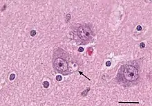 Granulovacuolar degeneration refers to the occurrence within neurons of abnormal, fluid-filled bubbles (vacuoles) containing a dense proteinaceous granule.[1] Granulovacuoles occur most commonly in pyramidal neurons of the hippocampus. They are present in small numbers in non-demented elderly people, but increase in frequency in Alzheimer's disease and other tauopathies.[2] In Alzheimer's disease, granulovacuoles proliferate stage-wise in different brain areas, and their prevalence is correlated with the degree of tauopathy, Abeta plaque pathology, and cerebral amyloid angiopathy.[2] Immunohistochemical analyses have found that the inner granule includes several proteins, including tubulin[3] tau protein, TDP-43 and others.[2] Although granulovacuoles and their functional significance are still poorly understood, they have been compared to autophagic vacuoles [4]