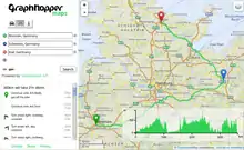 GraphHopper is an open-source routing library and server written in Java and provides a web interface called GraphHopper Maps[1] as well as a routing API over HTTP. It runs on the server, desktop, Android, iOS or Raspberry Pi.[2][3] By default OpenStreetMap data for the road network and elevation data from the Shuttle Radar Topography Mission is used.