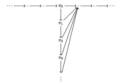 The Drinen-Tomforde Desingularization, often simply called desingularization, is a technique used to extend results for C*-algebras of row-finite graphs to C*-algebras of countable graphs. If is a graph, a desingularization of is a row-finite graph such that is Morita equivalent to .[7] Drinen and Tomforde described a method for constructing a desingularization from any countable graph: If is a countable graph, then for each vertex that emits an infinite number of edges, one first chooses a listing of the outgoing edges as , one next attaches a tail of the form