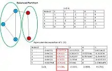 In such a scenario, the second smallest eigenvalue () of , yields a lower bound on the optimal cost () of ratio-cut partition with . The eigenvector () corresponding to , called the Fiedler vector, bisects the graph into only two communities based on the sign of the corresponding vector entry. Division into a larger number of communities can be achieved by repeated bisection or by using multiple eigenvectors corresponding to the smallest eigenvalues.[12] The examples in Figures 1,2 illustrate the spectral bisection approach.