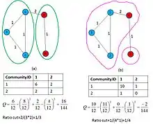 Minimum cut partitioning however fails when the number of communities to be partitioned, or the partition sizes are unknown. For instance, optimizing the cut size for free group sizes puts all vertices in the same community. Additionally, cut size may be the wrong thing to minimize since a good division is not just one with small number of edges between communities. This motivated the use of Modularity (Q)[13] as a metric to optimize a balanced graph partition. The example in Figure 3 illustrates 2 instances of the same graph such that in (a) modularity (Q) is the partitioning metric and in (b), ratio-cut is the partitioning metric.